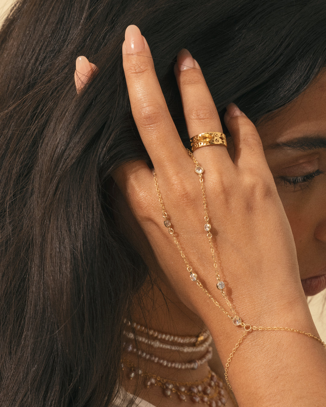 Thin yet strong, our hand jewelry uniquely complements your look to shine to the tips of your fingers.